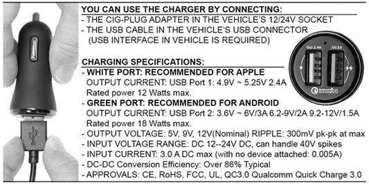 USB Type-C csatlakozóval. 2 USB-port: Type-A és Type-C, QC 3.0A + 2.4A. Csuklóval. 12/24 Volt. Állítható tartó, tokkal használt készülékhez: szélesség: 75–89 mm, vastagság: 8–12 mm.