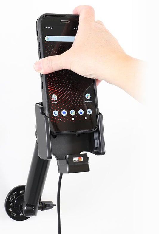 With tilt swivel. 5,4A charging. 12/24V. With Easy-switching system. Charging via pogo pins. Fits for device with or without handstrap, with/without extended battery.