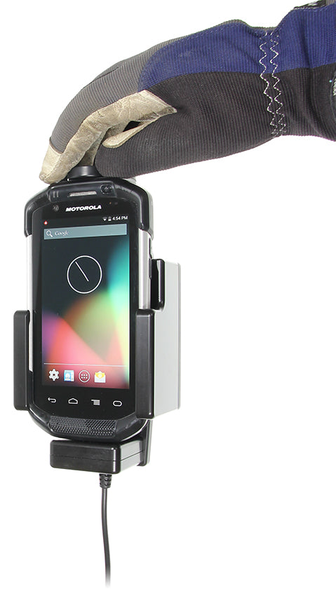 With USB-A cable + cig-plug adapter with 2 USB-A ports: QC 3.0A + 2.4A. With tilt swivel. 12/24 Volt. For device with/without extended battery (CT4X-BTEC-001), handstrap (CT47-HS-3PK-2) (CT47-HS-FM). With Easy-switching system.