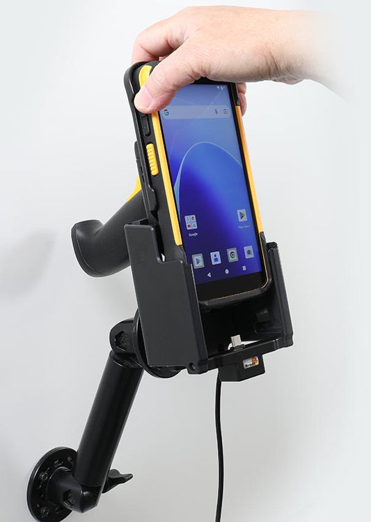 With USB-C cable. 2 USB ports: Type-A and Type-C: QC 3.0A + 2.4A. With tilt swivel. 2.7A charging. 12/24V. For device in Protective Rubber Boot (PRS3800X01507) and Pistol Grip (ARS38PSTNNN11).