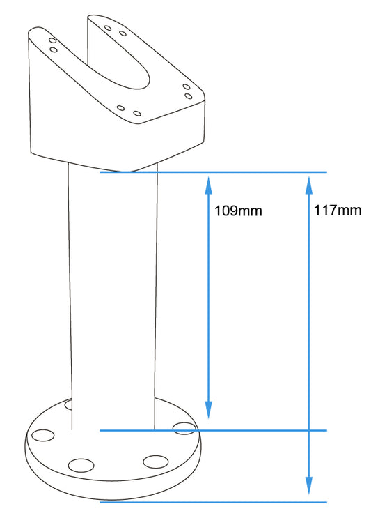Pedestal mount 4", finom fogazás. Teljes hossz: 114 mm. Kerek talp és felső lap, 64 mm átmérő. Több lyuk sugárirányú állításhoz. Fekete.