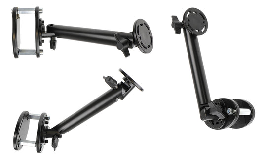 Targonca konzol nagy teherbírású 10"-os Pedestal mount-tal. Használható rudakhoz, csövekhez, lemezekhez 5–130 mm vastagságig, max. 87 mm szélességig. Hossz: 276 mm + bilincs. Csavarok, anyák, alátétek, imbuszkulcsok mellékelve. AMPS furatokkal.