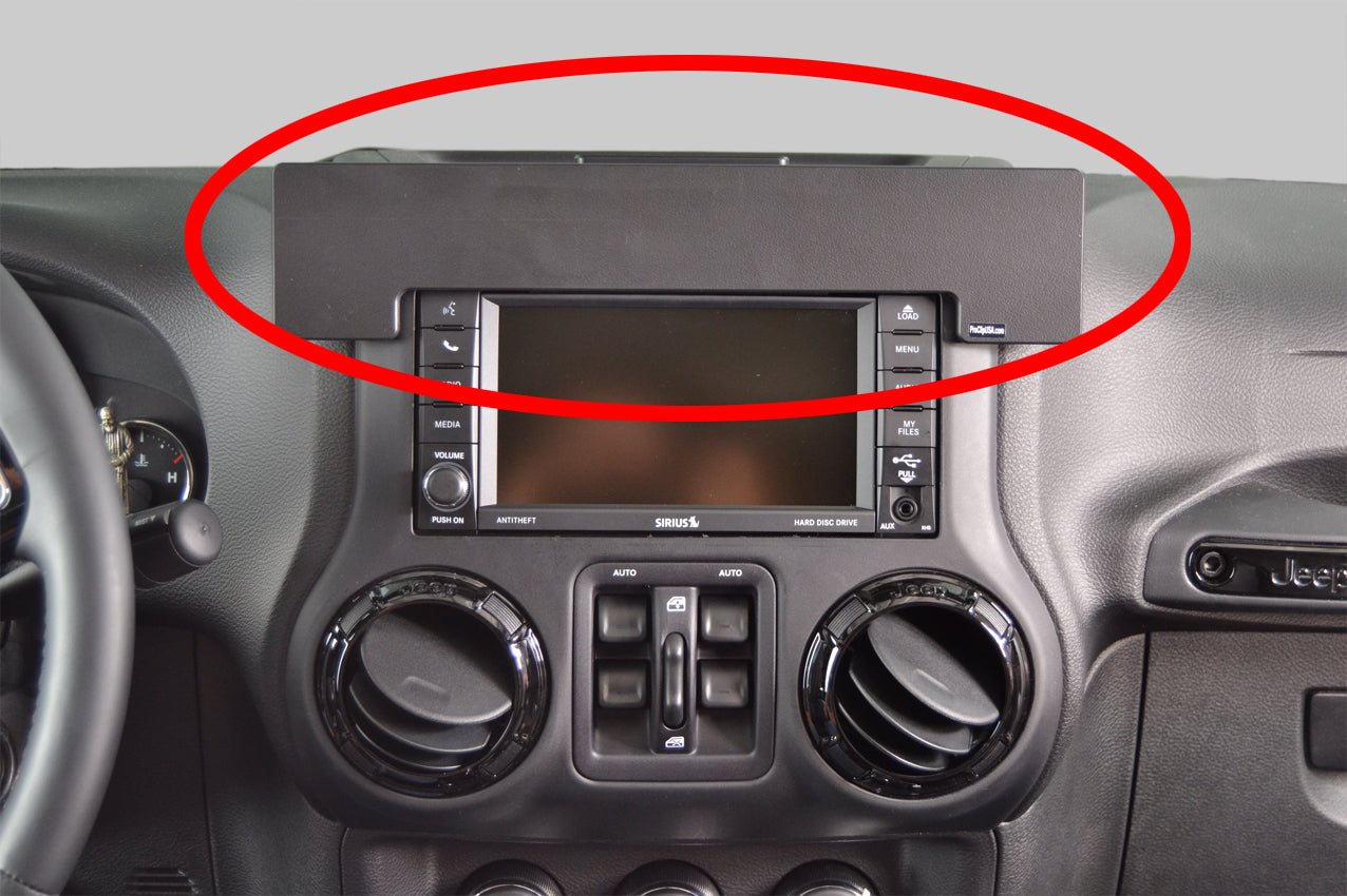 1. Use the enclosed alcohol pad to clean the area where the bracket is to be installed. Peel off the adhesive tape cover on the bracket. Press the angled edge on the lower part of the bracket into the seam/gap between the stereo/navigation screen and the surrounding panel frame.