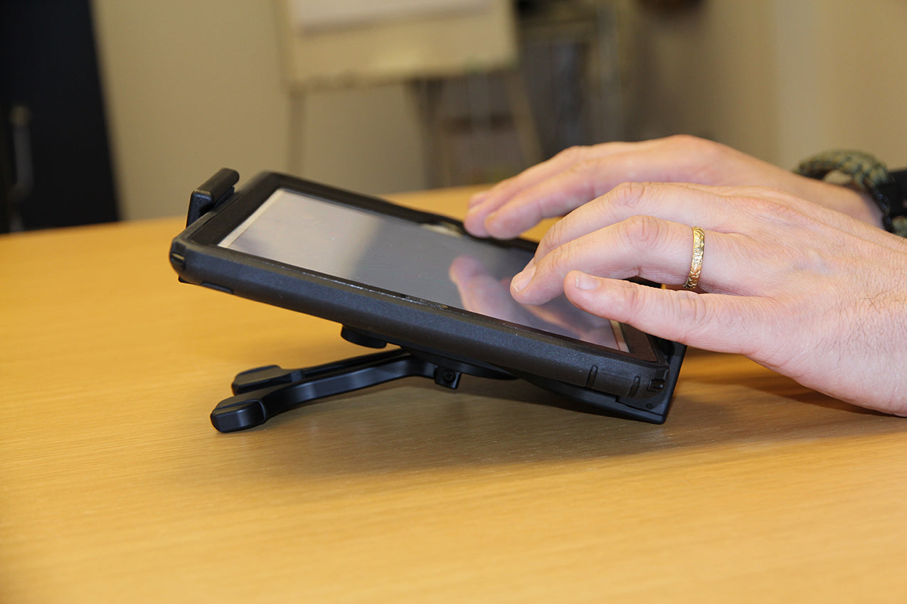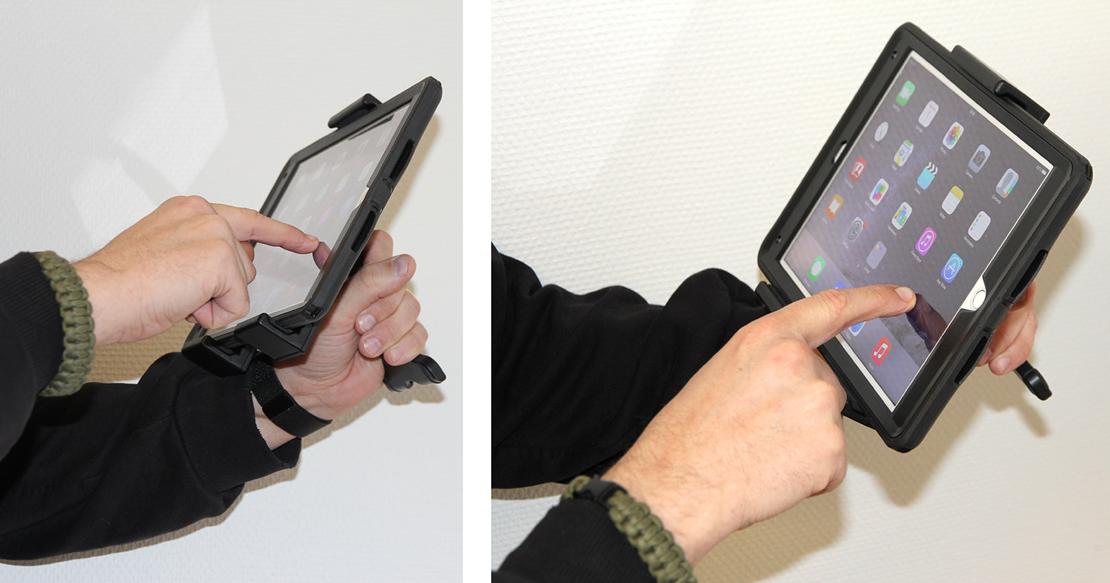 Mind otthon, az autóban vagy az irodában kényelmes a használata. Mivel az állványt könnyebb megfogni, mint az eszközt, a leejtés veszélye csökkenthető. Az állványt bármilyen szögbe beállíthatja. Bármilyen lapos felületre elhelyezhető a mellékelt szerelő adapter segítségével (cikkszám: 215461).