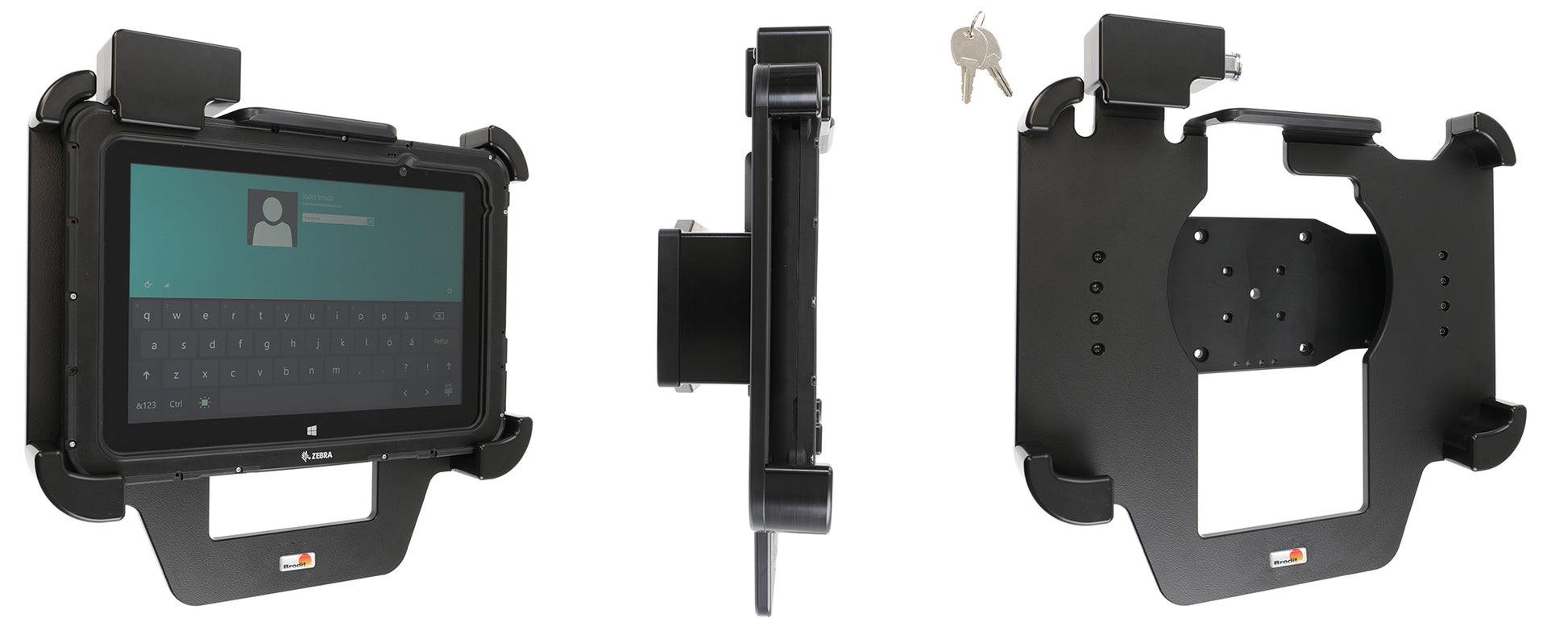 Extra erős tartó. Robusztus kerettel rendelkező készülékhez. Cserélhető akkumulátorhely. Zárral, 2 kulccsal. AMPS, VESA 75 furatokkal.