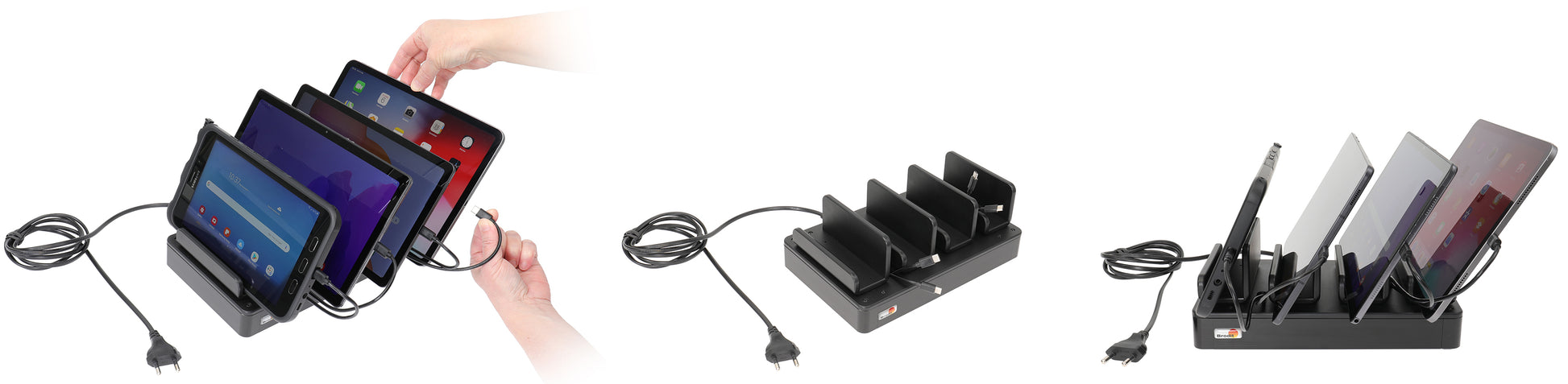 Egyszerre akár 4, C-típusú USB bemenettel rendelkező eszközt is tölthet! A töltőegységet a szállítmányozási vállalkozók, raktárak, iskolák és irodák, valamint az egészségügy, a rendőrség és a polgári védelem területén használják; mindenhol, ahol a tablet és mobil készülékek elengedhetetlenek a mindennapi munkához. Az asztali töltő dokkoló egyidejűleg képes négy eszközt is tölteni, minimális helyet foglal el, és ha sok egységet használ, több töltő dokk is szépen elhelyezhető egymás mellett.