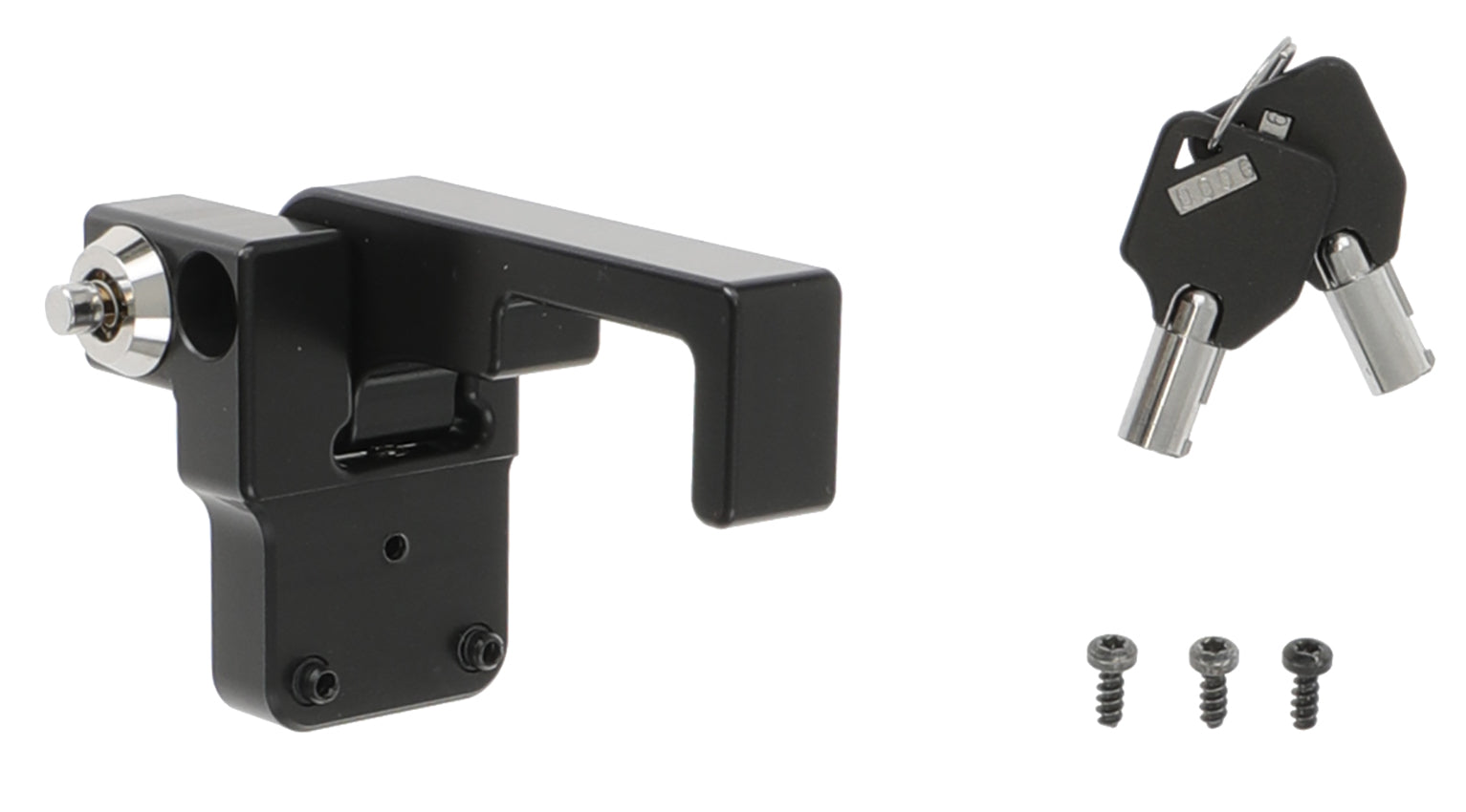3. Az eszköz tartóba helyezése: helyezze az eszközt a tartóba és nyomja előre az eszköz felső részét, hogy bepattanjon a helyére. Csúsztassa lefelé a zárat, majd nyomja be a gombot, hogy az eszközt a tartóba zárja. Az eszköz kivétele a tartóból: a zár nyitásához használja a mellékelt kulcsot. Csúsztassa felfelé a zárat. Emelje ki az eszközt a tartóból.