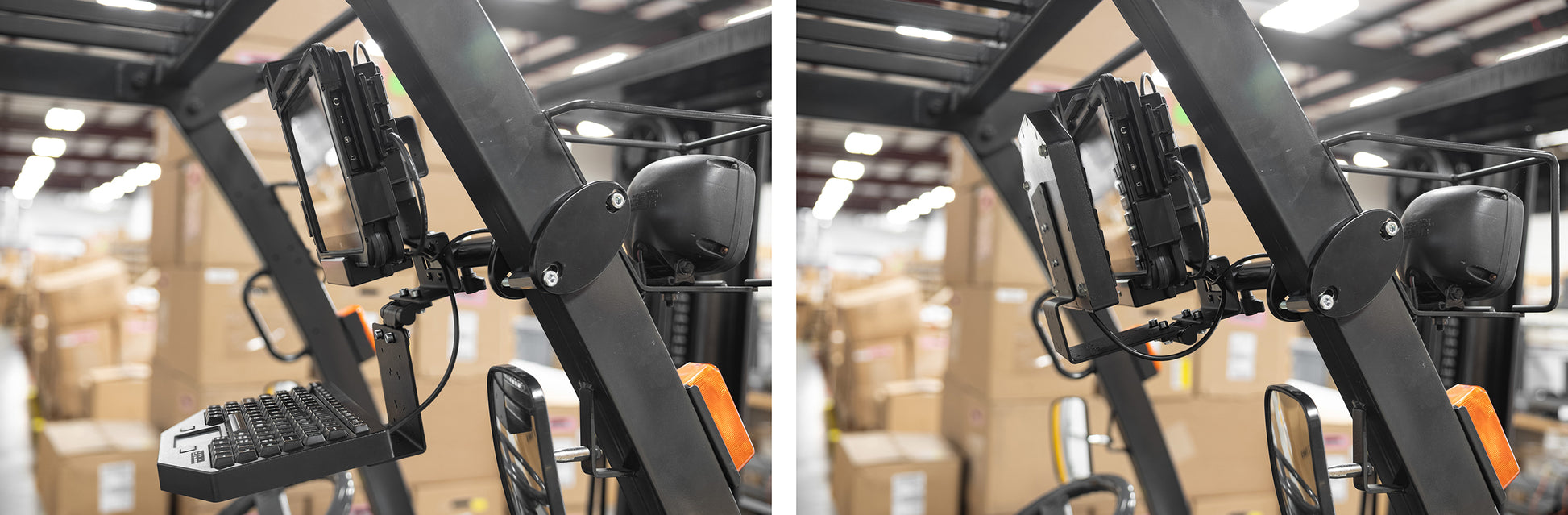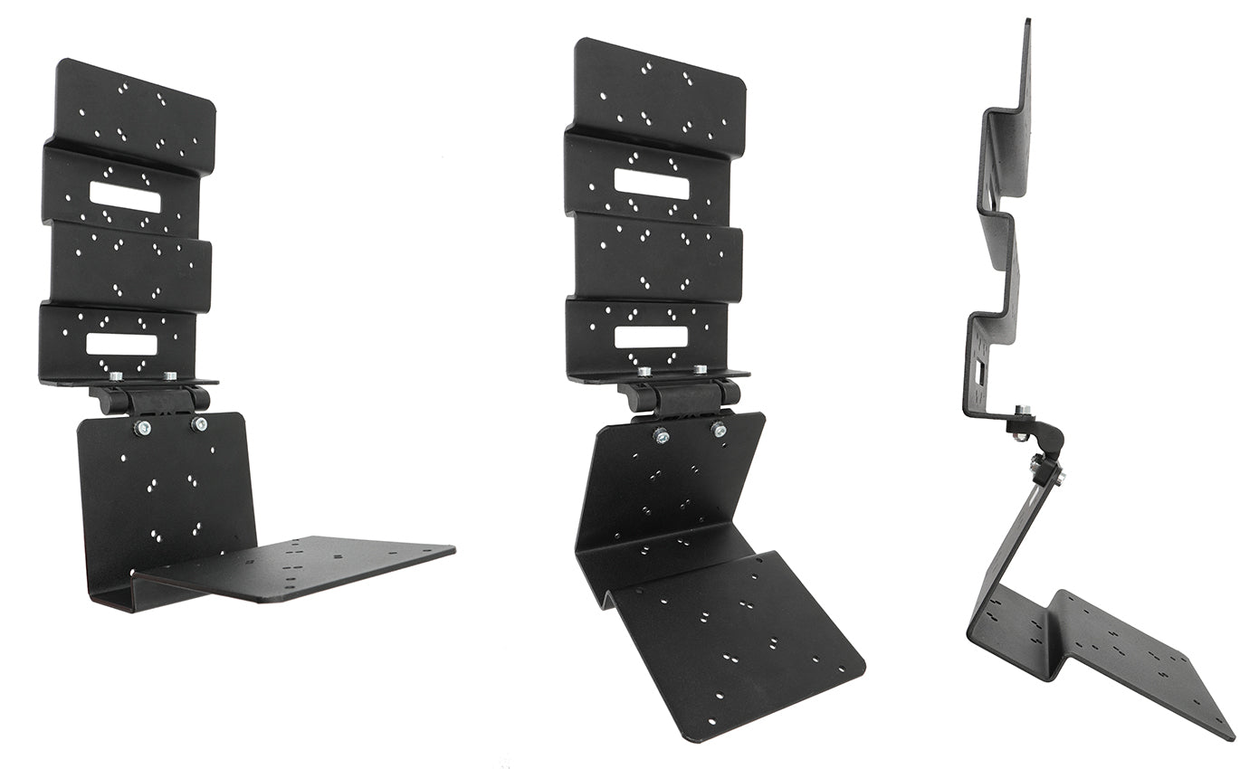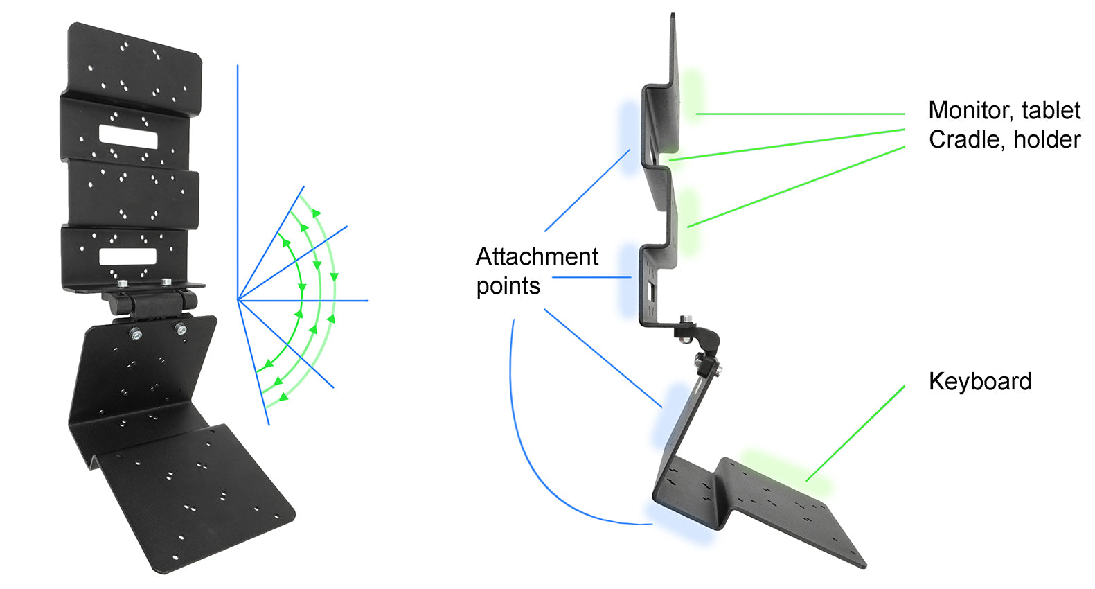 A két szekciót egy nagy teherbírású feszítő csukló köti össze. Ez lehetővé teszi a felhasználó számára, hogy gépelés közben a legkényelmesebb szöget állítsa be, és a tálcát a járművekben és targoncákban jellemző ütések és rezgések ellenére is a helyén tartja. Amikor nincs használatban, a zsanér segítségével a tartó könnyen félbehajtható, és a berendezés így jól tárolható, és a járművezető útjából kikerül. Szín: fekete. Porfestett acélból készült. Svédországban fejlesztették ki és gyártják.