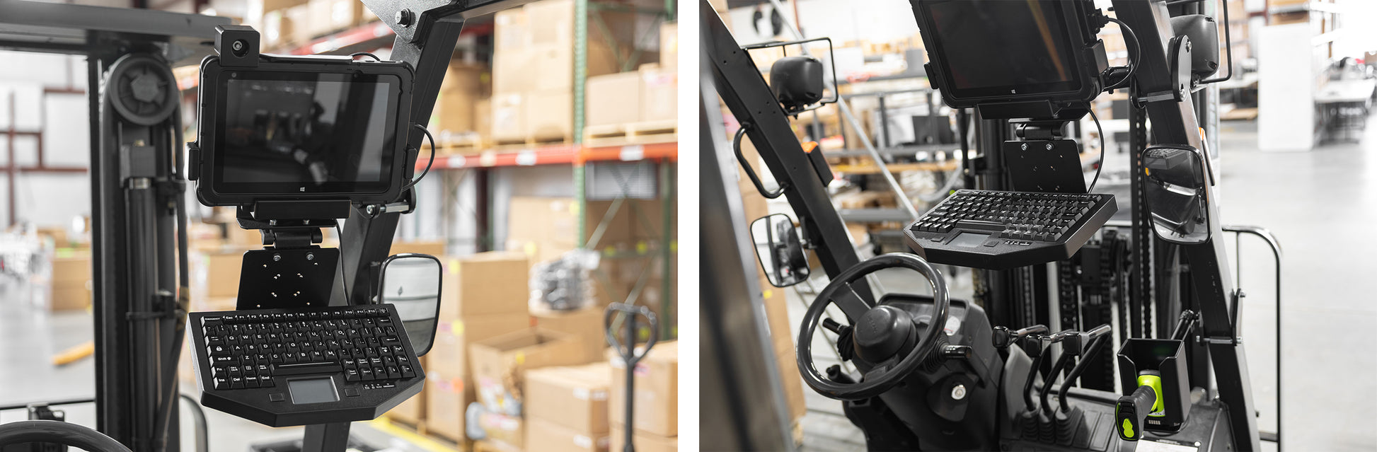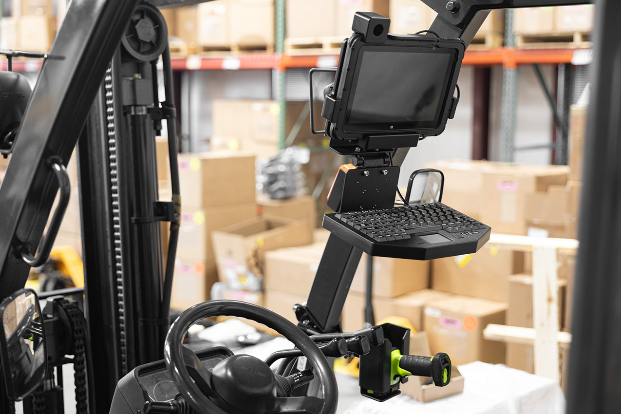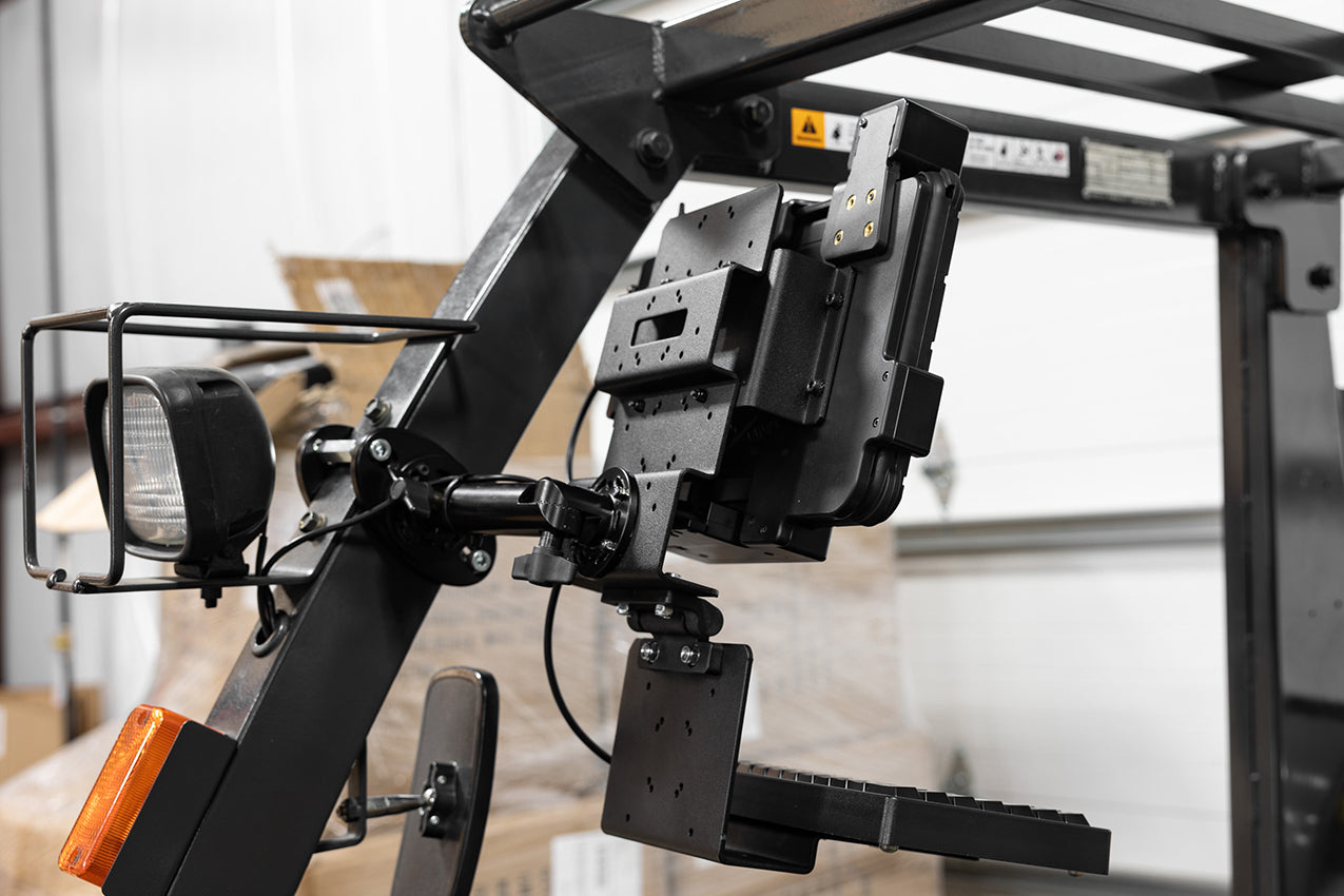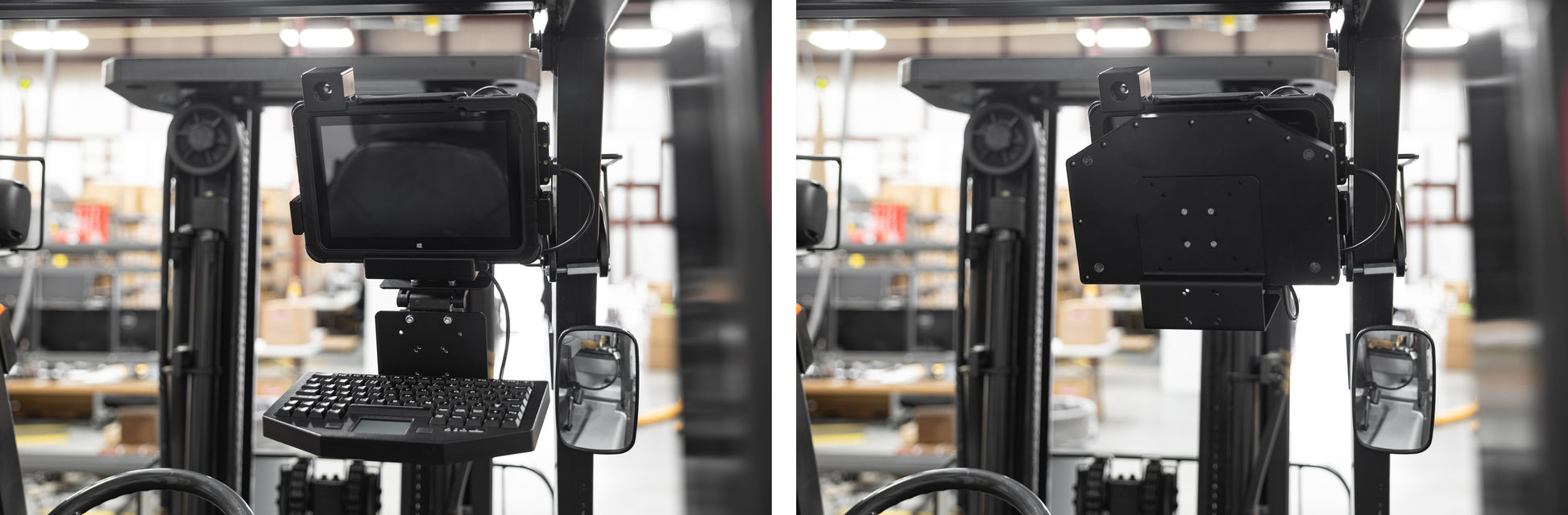 A két szekciót egy nagy teherbírású feszítő csukló köti össze. Ez lehetővé teszi a felhasználó számára, hogy gépelés közben a legkényelmesebb szöget állítsa be, és a tálcát a járművekben és targoncákban jellemző ütések és rezgések ellenére is a helyén tartja. Amikor nincs használatban, a zsanér segítségével a tartó könnyen félbehajtható, és a berendezés így jól tárolható, és a járművezető útjából kikerül. Szín: fekete. Porfestett acélból készült. Svédországban fejlesztették ki és gyártják.