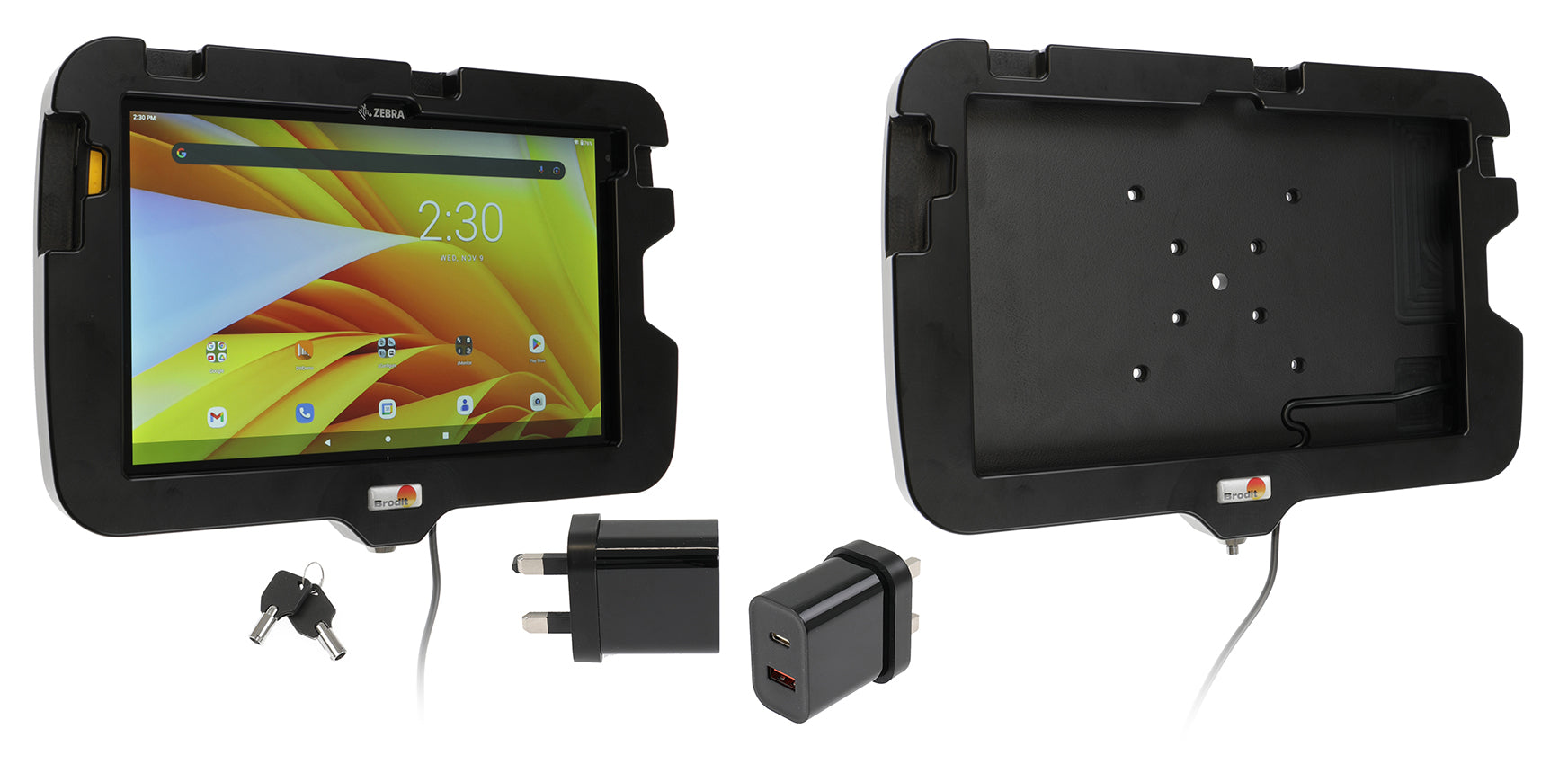 Fali tartó tápkábellel és brit fali adapterrel (QC + PD töltő). Rugged Boot / Exoskeleton nélküli készülékekhez. AMPS és VESA 75 lyukakkal.