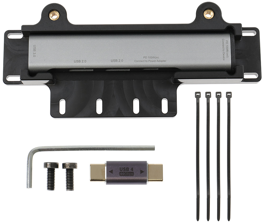 A hub USB-C Power Delivery áthaladással is rendelkezik, amely akár 100 W Power Delivery (PD) teljesítményt is támogat perifériák és táblagépek számára, így biztosítva a folyamatos áramellátást. A hub (1) USB-A 3.0 portot kínál az oldalán, és (2) USB-A 2.0 portot az alján. Különböző eszközöknek és adatátviteli sebességeknek felel meg.
