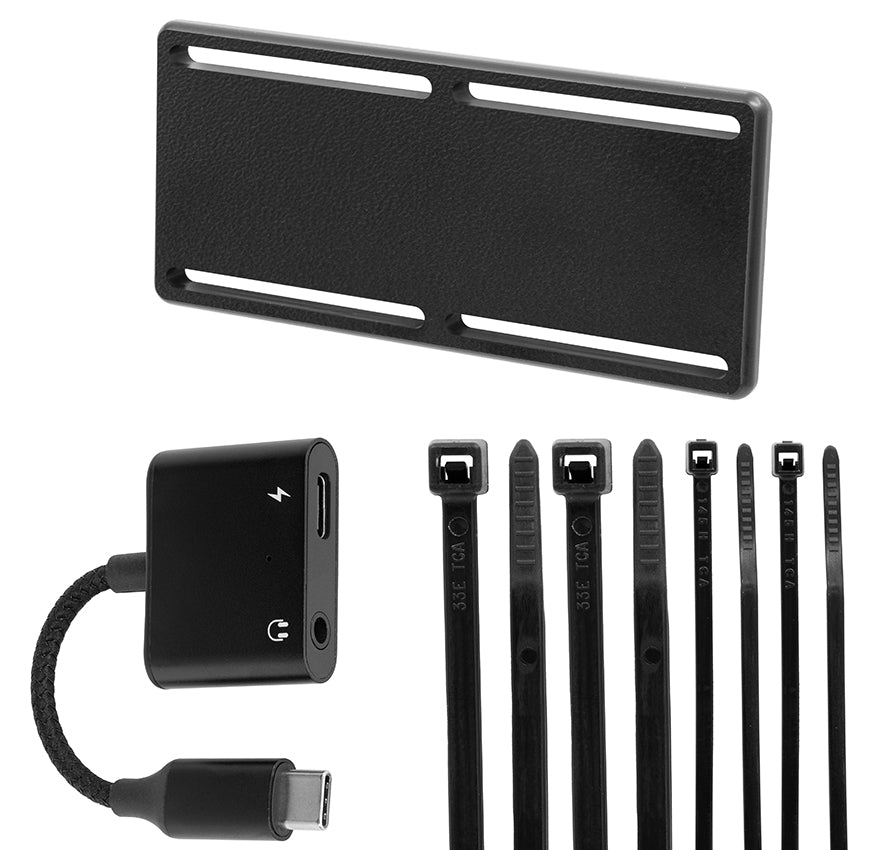 USB-C Splitter töltéshez (60W PD) és 3,5 mm-es audio, kábeltartóval és zipzáras kötegelőkkel.