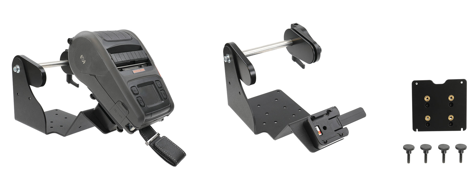 1. Helyezze a tartót az eszközre úgy, hogy a lyukak egyezzenek. Csavarja az eszközt a nyomtatóra a mellékelt rögzítőcsavarral.