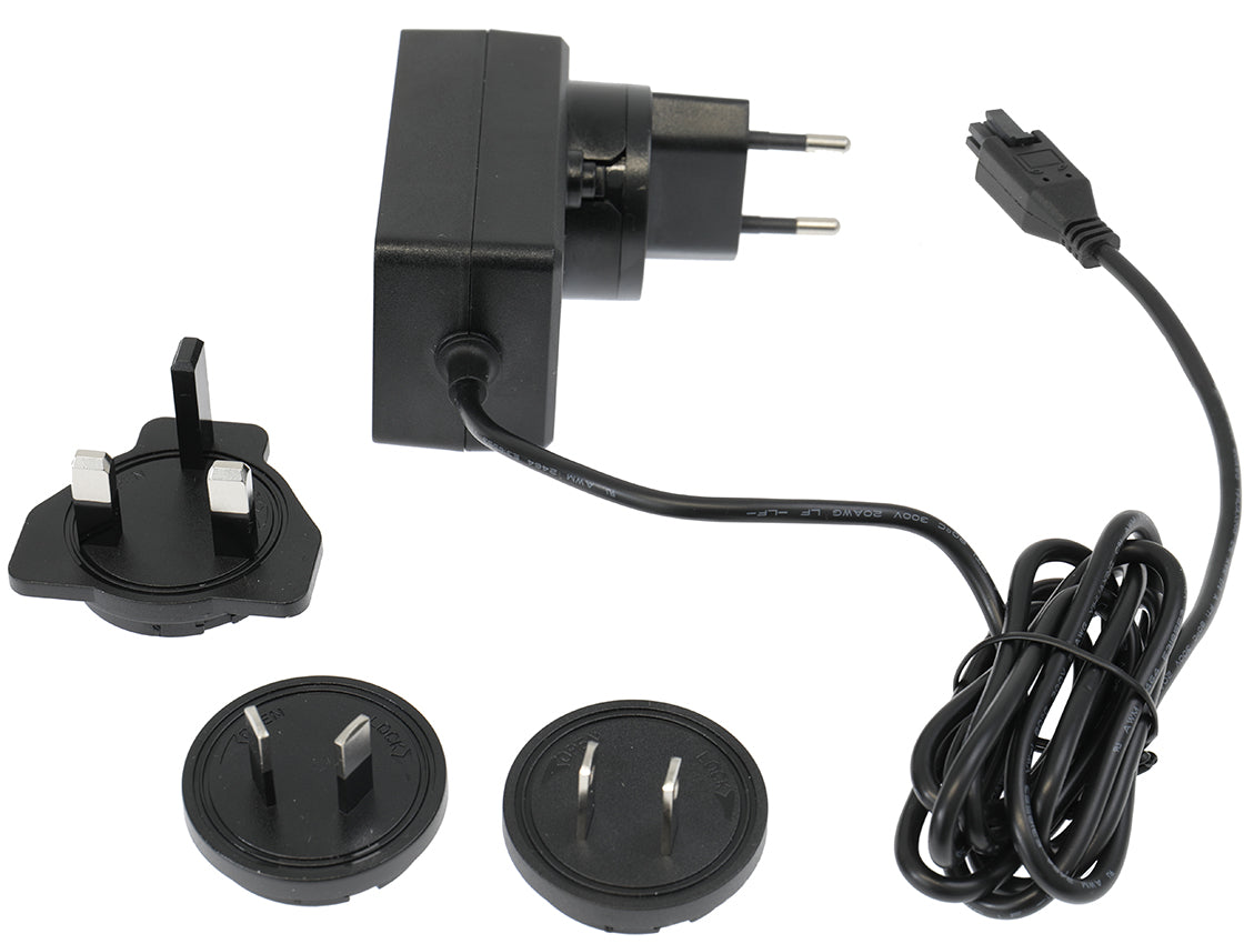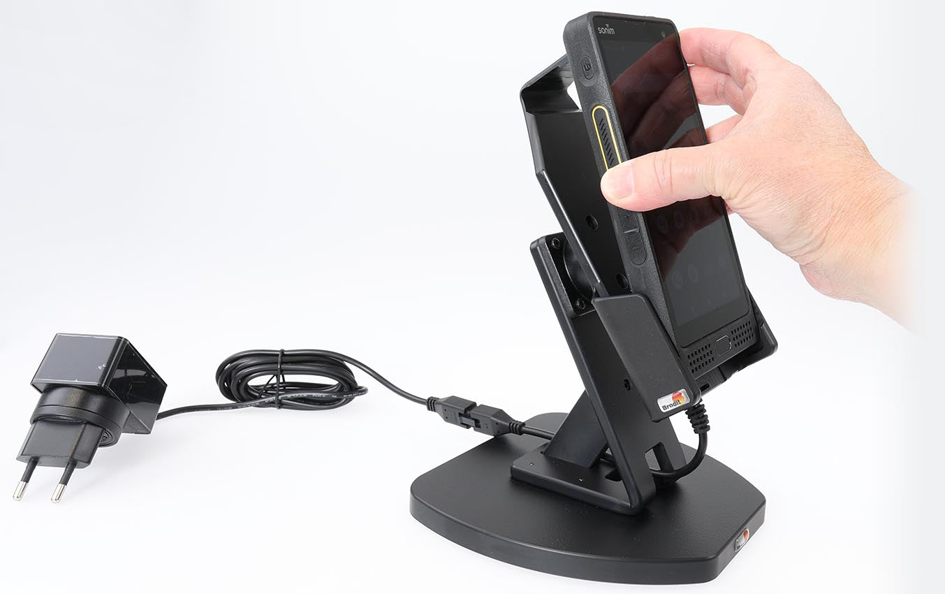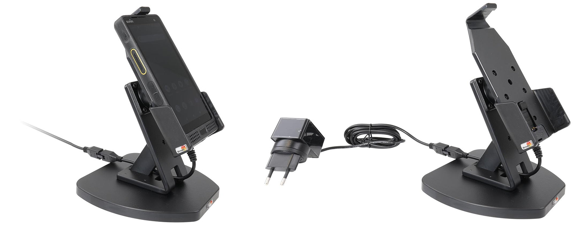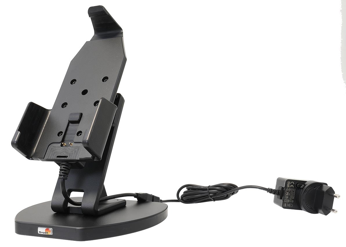 With tilt swivel. With power cable, worldwide adapters included. Charging via pogo pins.