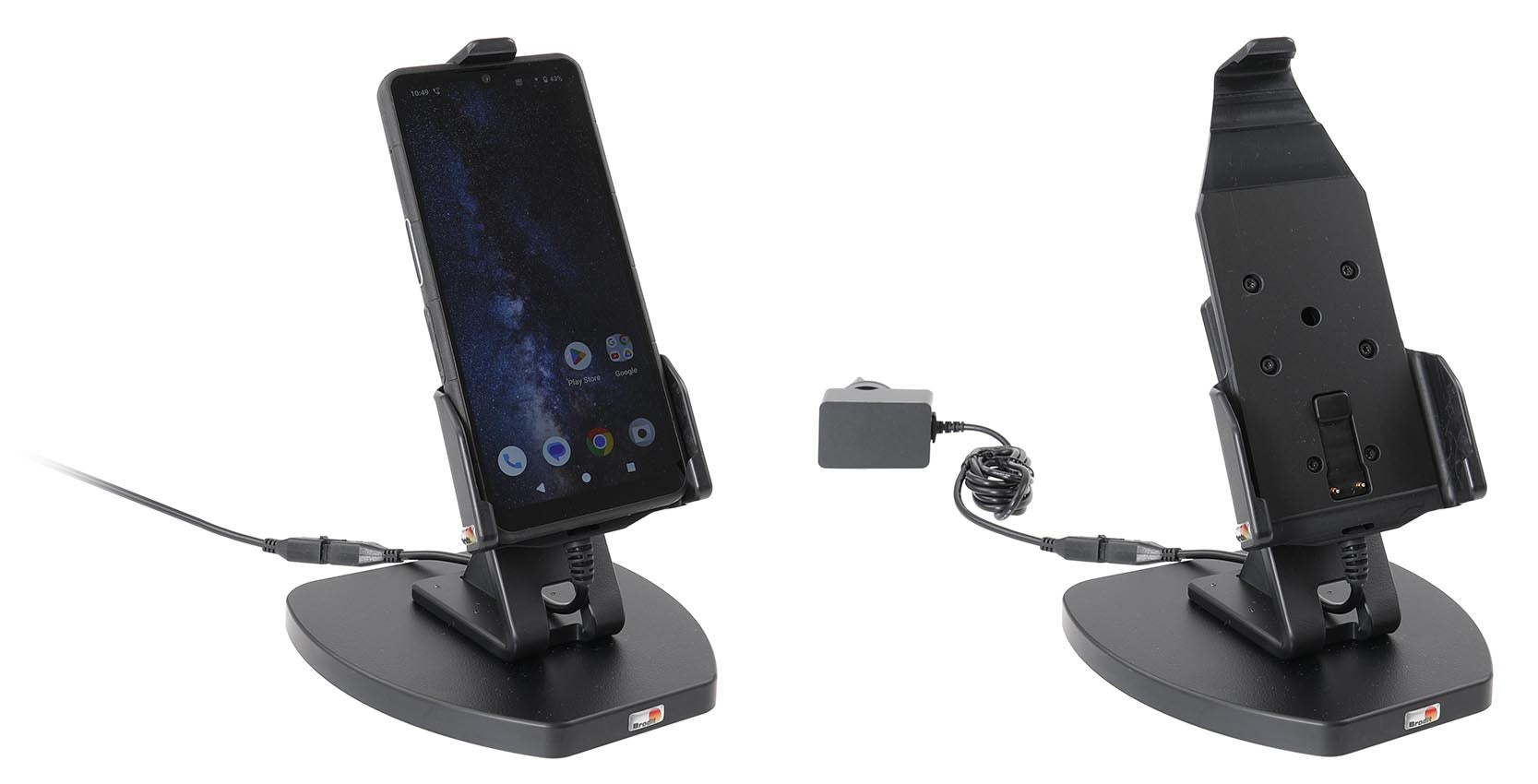 With tilt swivel. With power cable, worldwide adapters included. Charging via pogo pins.
