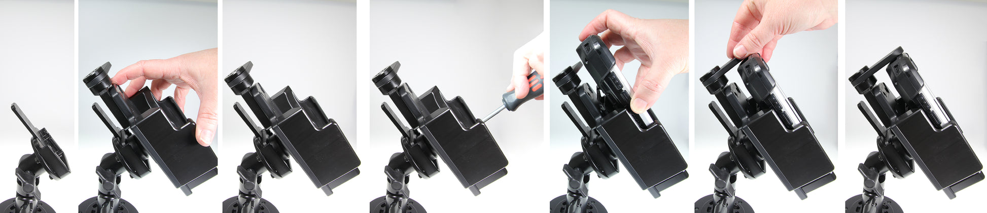 Mielőtt elkezdené a telepítést, kérjük, olvassa el a használati útmutatót és tekintse át a képeket. 1. Lazítsa meg a tartó közepén a csavart, így eltávolíthatja a csukló hátsó részét. 2. Helyezze a csukló talp részét a kívánt helyre. Ezután rögzítse a mellékelt csavarokkal. Helyezze a tartót a talp fölé úgy, hogy az illeszkedjen a csuklóval. Húzza meg a csavarokat, amíg a tartó szorosan a helyére nem kerül, de ez később még állítható. 3. Az eszköz behelyezése a tartóba: Helyezze az eszközt a tartó fölé és csúsztassa egyenesen lefelé, a tartóba. Fordítsa a forgatható felső részt úgy, hogy az eszközt a helyére "zárja". Az eszköz kivétele a tartóból: Fordítsa a forgatható felső részt úgy, hogy az eszköz szabaddá váljon. Emelje az eszközt egyenesen felfelé, ki a tartóból. 4. A tartó a helyére került. |