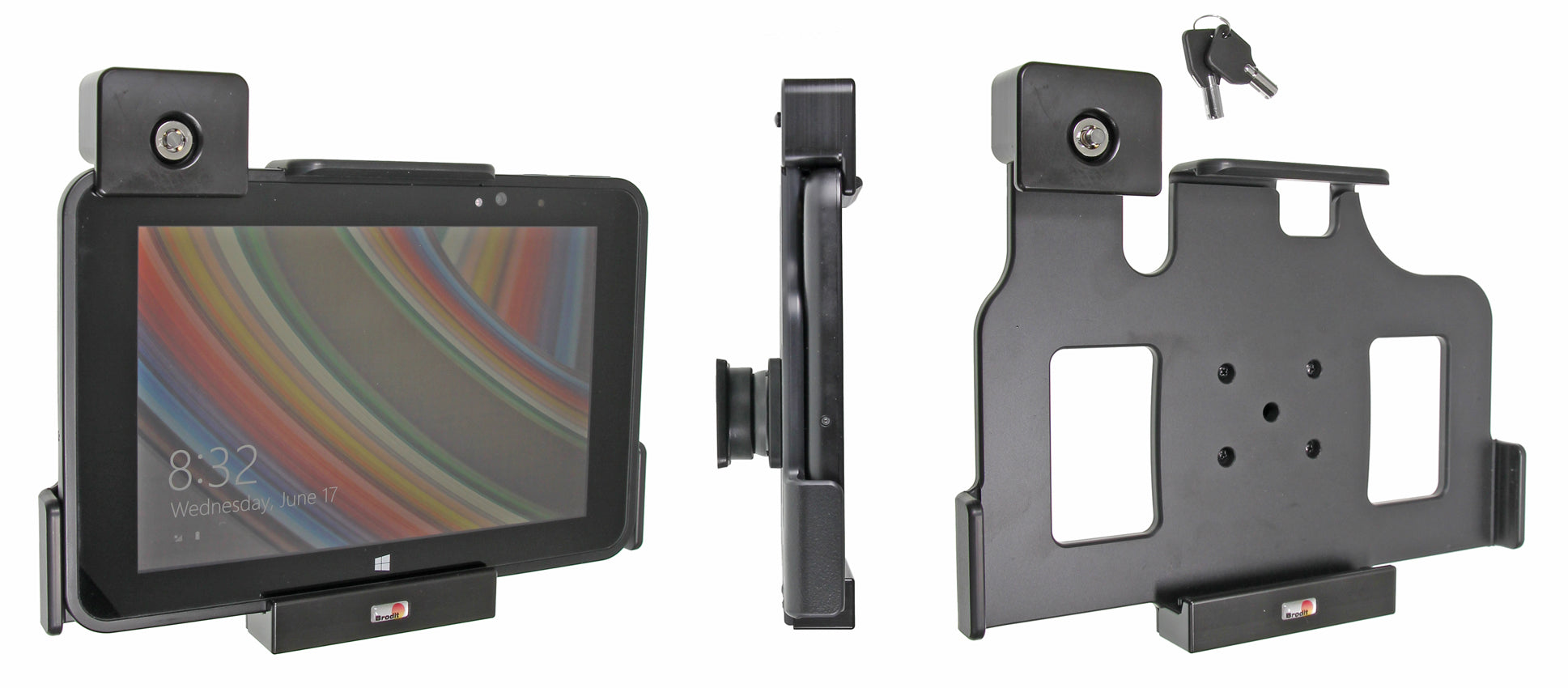 A tartó tökéletesen használható kiállításokon vagy üzletekben, vagy bárhol, ahol az a cél, hogy könnyen hozzáférhető legyen készüléke, de ne lehessen elmozdítani. A tartó extra erős műanyagból készült és zárral van ellátva. Kulcsra van szüksége a készülék eltávolításához: 2 kulcsot mellékeltünk. A tartó csuklóval van felszerelve, így állíthatósága miatt elkerülhetjük a fényvisszaverődést. Könnyen válthat a függőleges és vízszintes pozíciók között a tartó elfordításával.