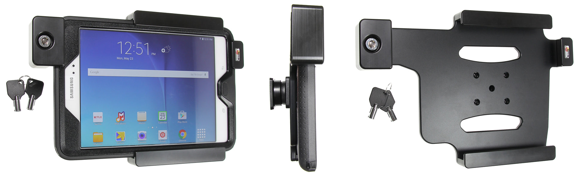 The holder is also perfect for use in stores, at exhibitions and any place where you want to use your Galaxy Tab A 8.0 without having it easy removable. The holder is made of extra strong plastic and is equipped with a lock. In order to remove the tablet from the holder you need the key, two keys are included. The holder is mounted onto a tilt swivel. This mean that you can adjust the angle in order to avoid light reflection on the screen. You can easily switch between portrait and landscape mode by turning the holder into desired position.