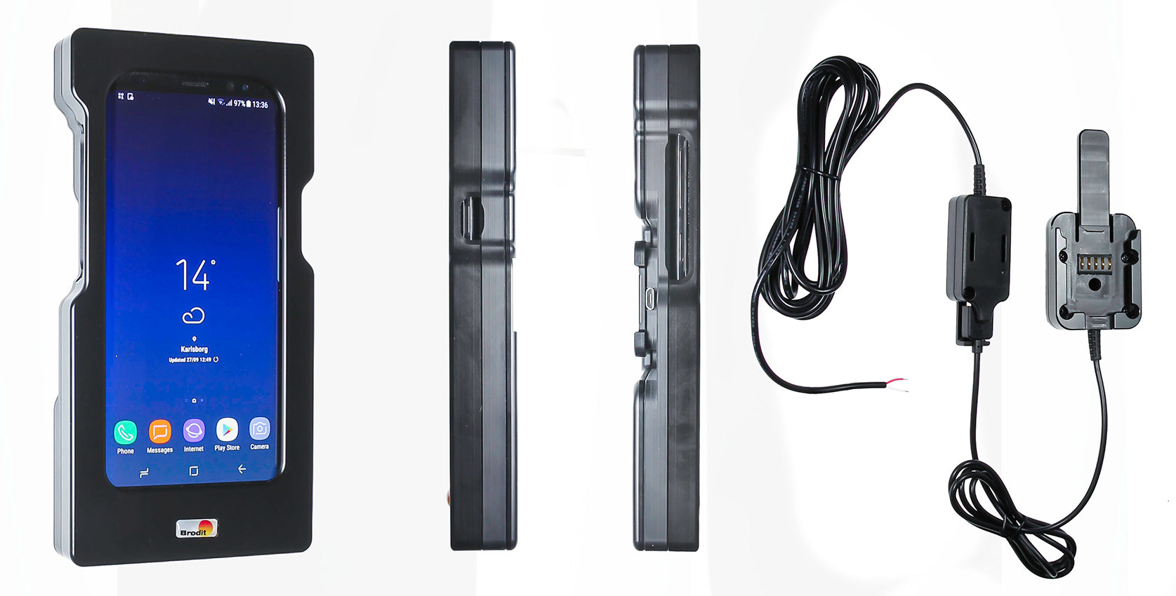 Az eszköz biztonságban van és a csavarok meglazítása nélkül nem tudja kivenni a tokból. Fix bekötéssel. 12/24V. A termék E jóváhagyással rendelkezik. Csatlakoztassa a hálózati kábelt egy 2A-s biztosítékhoz. Professzionális felszerelés javasolt. A tartó csuklóval van felszerelve, így állíthatósága miatt elkerülhetjük a fényvisszaverődést. Könnyen válthat a függőleges és vízszintes pozíciók között a tartó elfordításával. Teljes hozzáférést biztosít a kamerához és az összes gombhoz, amikor az eszköz a tartóban van. Kiváló minőségű fekete ABS és Acetal műanyagból készül Svédországban. ProClipre vagy extra erős szerelési alaplapra szereljük fel.