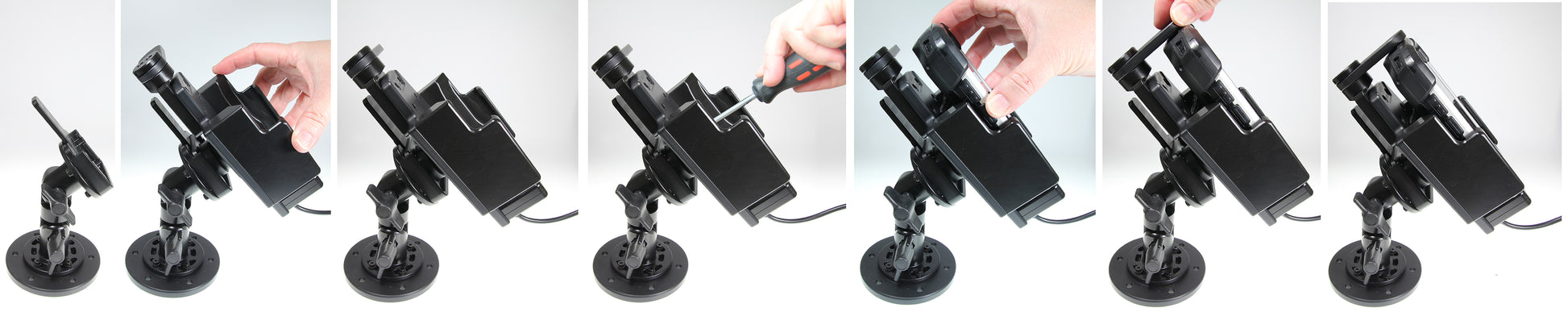 Mielőtt elkezdené a telepítést, kérjük, olvassa el a használati útmutatót és tekintse át a képeket. 1. Lazítsa meg a tartó közepén a csavart, így eltávolíthatja a csukló hátsó részét. 2. Helyezze a csukló talp részét a kívánt helyre. Ezután rögzítse a mellékelt csavarokkal. Helyezze a tartót a talp fölé úgy, hogy az illeszkedjen a csuklóval. Húzza meg a csavarokat, amíg a tartó szorosan a helyére nem kerül, de ez később még állítható. 3. Az eszköz behelyezése a tartóba: Helyezze az eszközt a tartó fölé és csúsztassa egyenesen lefelé, a tartóba. Fordítsa a forgatható felső részt úgy, hogy az eszközt a helyére "zárja". Az eszköz kivétele a tartóból: Fordítsa a forgatható felső részt úgy, hogy az eszköz szabaddá váljon. Emelje az eszközt egyenesen felfelé, ki a tartóból. 4. A tartó a helyére került. |