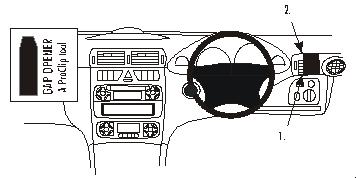 Figyelem! Összeszerelés előtt kérjük, figyelmesen olvassa el a használati útmutatót! 1. Távolítsa el az öntapadó felület borítását a ProClipen. Nyomja a ProClip alsó részét a műszerfal és a légrács körüli keret közé. 2. Helyezze a mellékelt réstágítót a műszerfal és a légrács körüli keret közé, hogy kitágítsa a rést. A légrács jobb oldala fölött nyomja a résbe. 3. Nyomja a ProClip felső részét a résbe közvetlenül a réstágító mellett. Ha a rés túl szűk, akkor tolja a réstágítót a ProClip bal oldala felé és nyomja lefelé a ProClip felső rész mellett jobbról és balról. Húzza ki a réstágítót. 4. A ProClip a helyére került. |