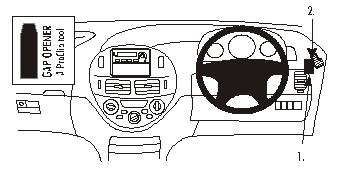 Figyelem! Összeszerelés előtt kérjük, figyelmesen olvassa el a használati útmutatót! 1. Helyezze a mellékelt réstágítót a műszerfal és a légrács körüli keret közé, hogy kitágítsa a rést. Távolítsa el az öntapadó felületek borítását a ProClipen. 2. Nyomja a ProClip jobb, hajlított oldalát a résbe a réstágító fölött. 3. Akassza a ProClip bal oldalát a légrácsba a rács körüli keret alá-mögé. Húzza ki a réstágítót. 4. A ProClip a helyére került. |