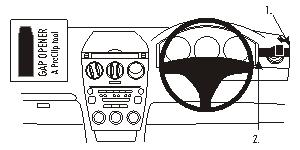 Figyelem! Összeszerelés előtt kérjük, figyelmesen olvassa el a használati utasítást és nézze meg az ábrákat, mielőtt rögzíti a ProClip-et! 1. Távolítsa el az öntapadó felület borítását a ProClipen. Nyomja a ProClip bal oldali hajlított szélét a műszerfal oldalfalán lévő résbe. 2. Nyomja a mellékelt réstágítót a műszerfal és a műszerfal körüli keret közé, hogy kitágítsa a rést. 3. Húzza a ProClip jobb oldalát jobbra. Nyomja a ProClip hajlított jobb oldalát a résbe a réstágító fölött. Húzza ki a réstágítót. 4. A ProClip a helyére került. |