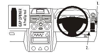 Figyelem! Összeszerelés előtt kérjük, figyelmesen olvassa el a használati utasítást és nézze meg az ábrákat, mielőtt rögzíti a ProClip-et! 1. Nyomja a mellékelt réstágítót a műszerfal és a légrács körüli keret közé, hogy kitágítsa a rést. Távolítsa el az öntapadó felület borítását a ProClipen. 2. Nyomja a ProClip felső, lekerekített részét a résbe, közvetlenül a réstágító mellett. Hajtsa a ProClip alsó részét lefelé a műszerfal irányába, hogy a lekerekített él beakadjon a légrács körüli keret mögé. Húzza ki a réstágítót. 3. Akassza a ProClip alsó, hajlított részét a műszerfal éle alá. 4. A ProClip a helyére került. |