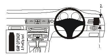 Figyelem! Összeszerelés előtt kérjük, figyelmesen olvassa el a használati utasítást és nézze meg az ábrákat, mielőtt rögzíti a ProClip-et! 1. Nyomja a mellékelt réstágítót a légrács körüli keret és a műszerfal közötti résbe, hogy kitágítsa a rést. Távolítsa el az öntapadó felület borítását a ProClip. 2. Nyomja a ProClip alsó, hornyos részét a résbe, közvetlenül a réstágító mellett. Nyomja amíg nem érzi, hogy a helyére ugrott. Húzza ki a réstágítót. 3. Helyezze a réstágítót a műszerfal és a légrács körüli keret közötti résbe. Nyomja előre a ProClipet, hogy a felső hajlított él beakadjon a résbe, közvetlenül a réstágító mellett. Húzza ki a réstágítót. 4. A ProClip a helyére került. |