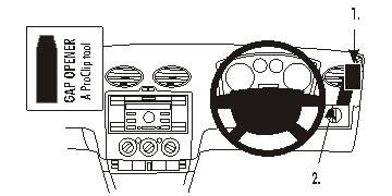 Figyelem! Összeszerelés előtt kérjük, figyelmesen olvassa el a használati utasítást és nézze meg az ábrákat, mielőtt rögzíti a ProClip-et! 1. Nyomja a mellékelt réstágítót a műszerfal és a kapcsoló panel közötti résbe, hogy kitágítsa a rést. 2. Akassza-nyomja a ProClip fölső lekerekített élét a műszerfal és a légrács keret közötti résbe. Hajtsa le a ProClipet, hogy a lekerekített felső él beakadjon a légrács alá. 3. Nyomja a ProClip alsó, hornyos részét a résbe, közvetlenül a réstágító mellett. Nyomja amíg nem érzi, hogy a helyére ugrott. Húzza ki a réstágítót. 4. A ProClip a helyére került. |