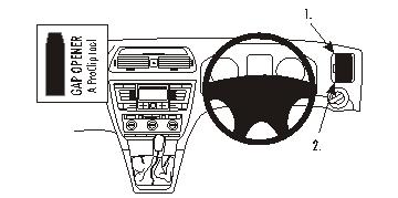 Szerelés előtt kérjük, figyelmesen olvassa el a használati utasítást és nézze meg az ábrákat, mielőtt rögzíti a ProClip-et! 1. Nyomja a mellékelt réstágítót a műszerfal és a légrács körüli keret közé, hogy kitágítsa a rést. Távolítsa el az öntapadó felület borítását a ProClipen. 2. Feszítse a rést kicsit nagyobbra, közben nyomja a ProClip felső, hajlított peremét a résbe, közvetlenül a réstágító mellett. Húzza ki a réstágítót. 3. Helyezze a réstágítót a műszerfal és a légrács körüli keret közötti résbe. Feszítse a rést kicsit nagyobbra, közben nyomja a ProClip alsó, hornyos részét a résbe, közvetlenül a réstágító mellett. Nyomja amíg nem érzi, hogy a helyére ugrott. Húzza ki a réstágítót. 4. A ProClip a helyére került. |