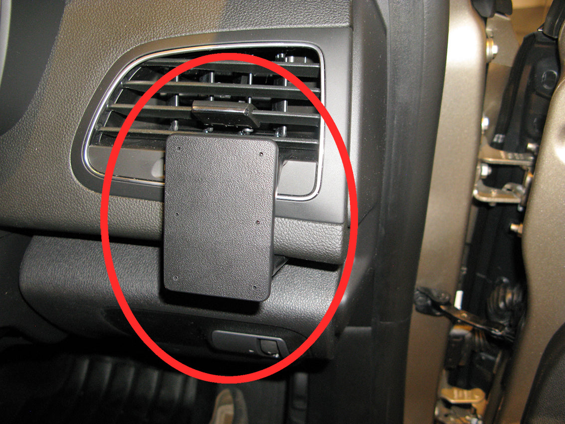 1. Használja a mellékelt alkoholtartalmú törlőkendőt a terület megtisztításához, ahová a ProClip-et telepíteni kívánja. Távolítsa el a ragasztószalag borítását a ProClip-ről. Nyomja a ProClip hosszú alsó részét a légbeömlőt körülvevő panel és a műszerfal közötti résbe.