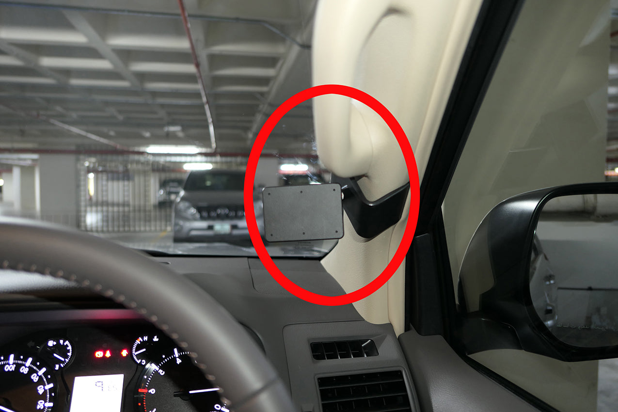 1. A mellékelt alkoholos párnával tisztítsa meg azt a területet, ahová a tartó felszerelésre kerül. Húzza le a ragasztószalagos borítást. Húzza ki az A oszlopon lévő gumitömítést. Nyomja be a tartó alsó részét a résbe, és akassza be az A oszlop mögé.