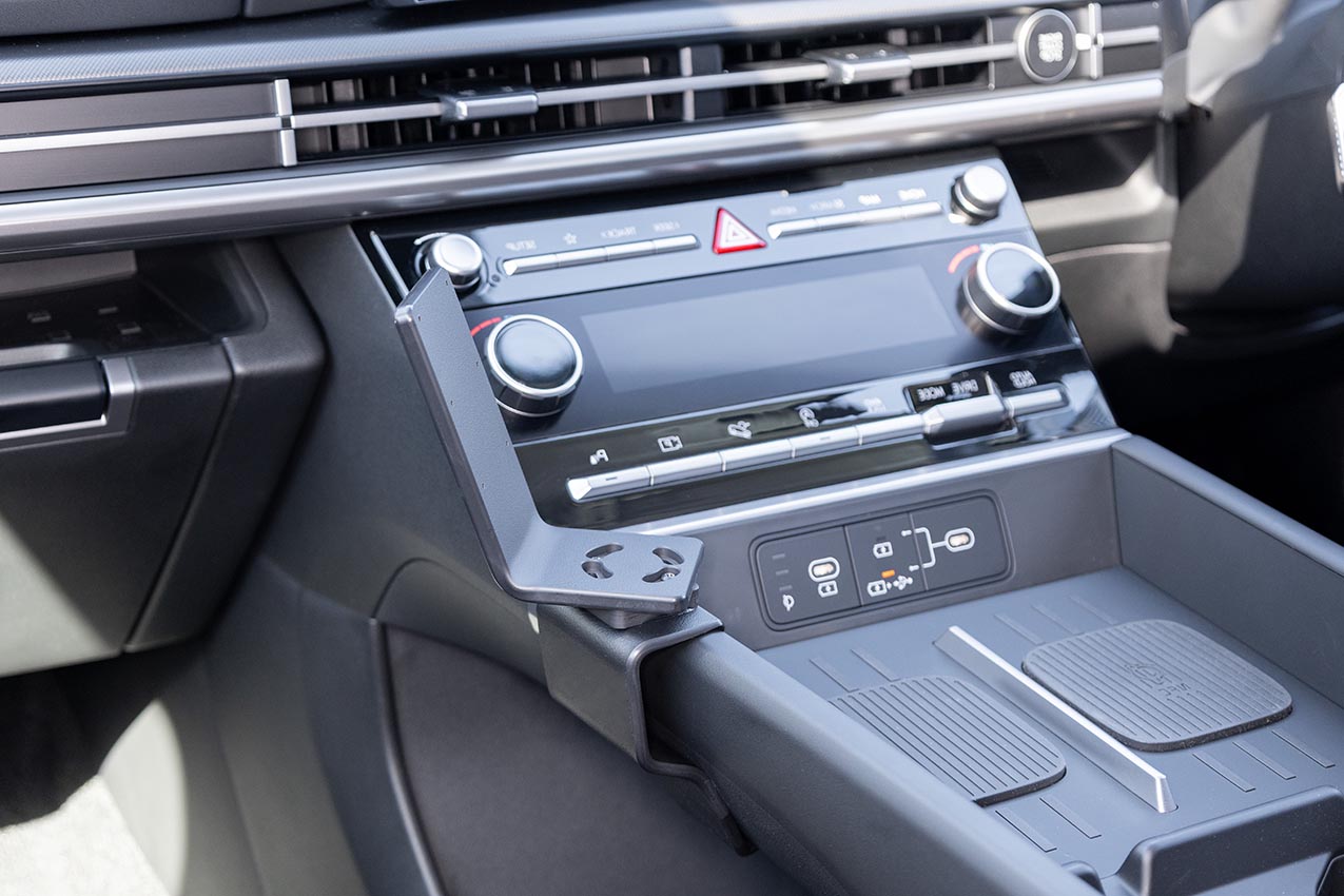 2. Align the lower edge with the gap in the bottom console seam. Press downward on the left side of the mount and press the lower part toward the console sidewall so the edge hooks into the gap.