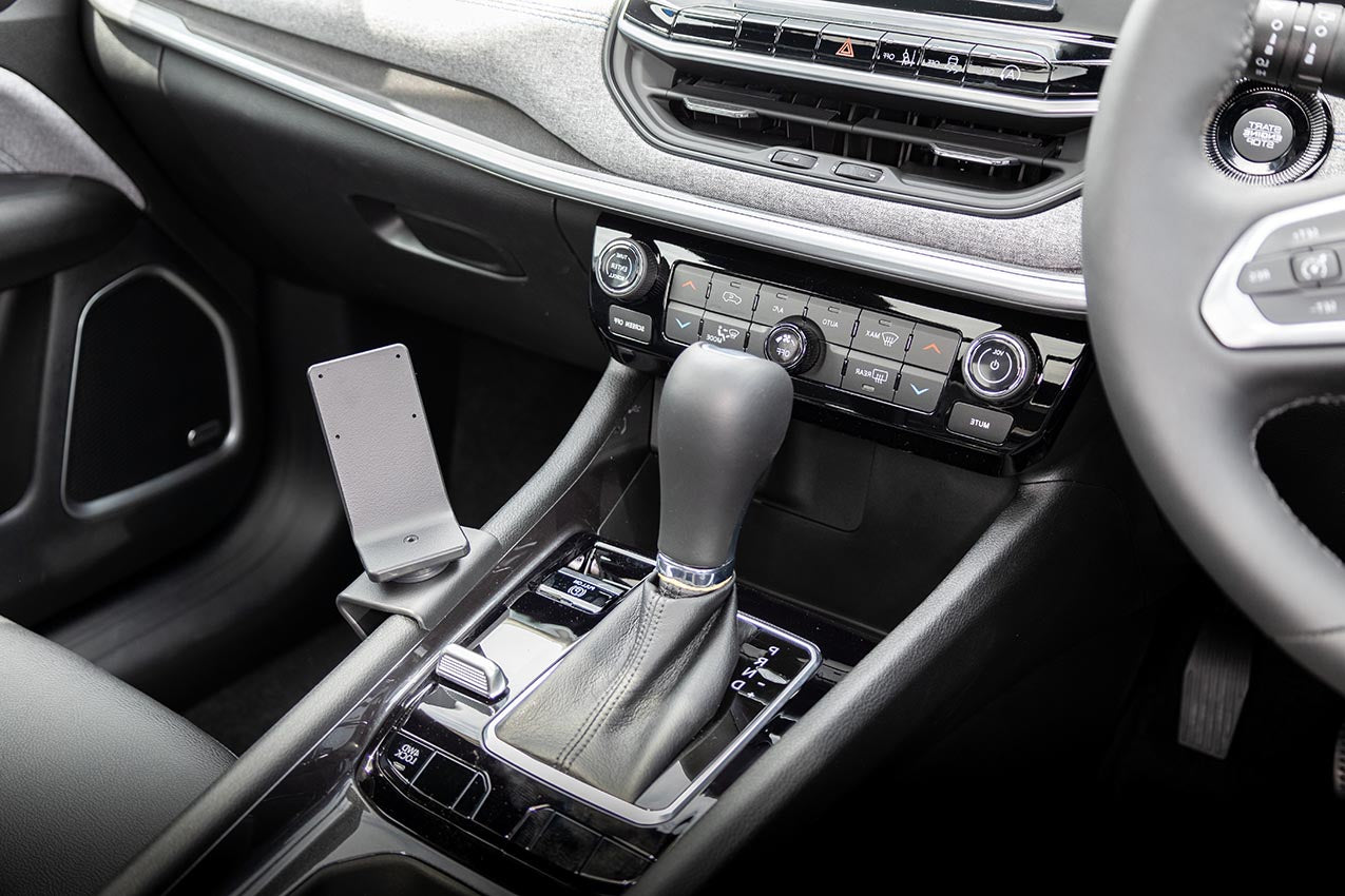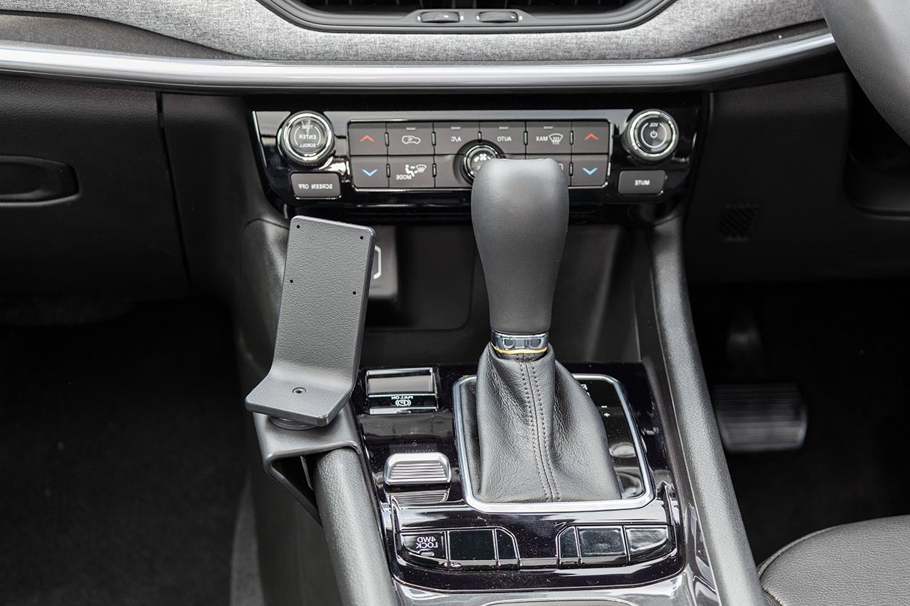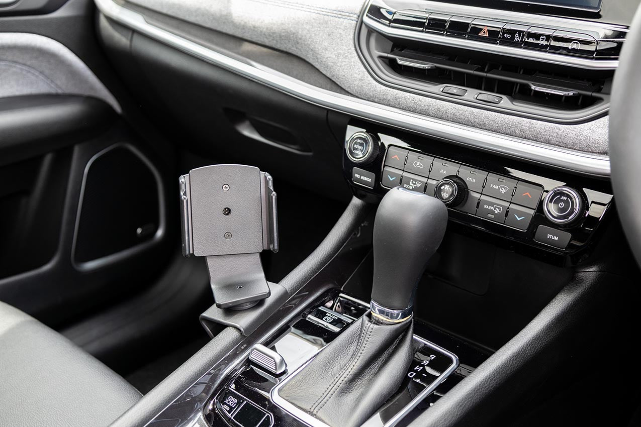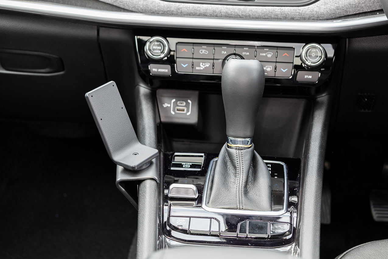 1. Igazítsa a tartót a kézifék kar és az üzemmód váltó kapcsoló közé, ahogy a képen látható. Akassza a tartó felső szélét a konzol keretének szélére.