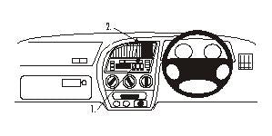 Figyelem! Mielőtt a ProClip-et rögzítené, kérjük, figyelmesen olvassa el a használati útmutatót! 1. Nyomja a ProClip alsó, szögletes részét a légbefúvó és a panel-keret közti résbe az 1-es pozícióban! 2. Nyomja a ProClip felső, barázdált részét a légbefúvó és a párnázott műszerfal közti résbe a 2-es pozícióban! |