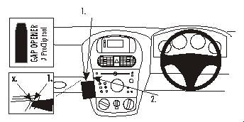 Kérjük, olvassa el az összes utasítást és tanulmányozza a képeket, mielőtt a tartót rögzítené! 1. Nyissa ki a kesztyűtartót! Lazítsa meg a csavart a kesztyűtartó bal felső sarkánál! A mellékelt réstágító keskeny végének segítségével tágítsa ki a rést a szabályzó-panel és a műszerfal között! Távolítsa el a ragasztócsík borítását a ProClip-ről! 2. Nyomja a ProClip jobb oldali részének szögletes peremét a kesztyűtartó és a műszerfal közti résbe! Csúsztassa a ProClip-et fölfelé, amennyire lehetséges! Húzza a ProClip-et balra úgy, hogy a szögletes jobb pereme beakadjon a résbe, és a bal vége beakadjon a műszerfal szegélye mögé! Nyomja a ProClip bal oldali részének szögletes peremét a réstágító alatti résbe! 3. Húzza ki a réstágítót! Húzza meg a csavart! Csukja be a kesztyűtartót! 4. A ProClip a helyére került. |