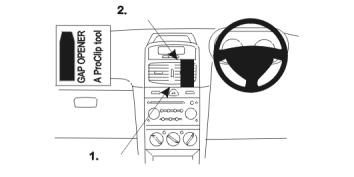 Figyelem! Mielőtt a ProClip-et rögzítené, kérjük, figyelmesen olvassa el a használati útmutatót! 1. Nyomja a mellékelt réstágító keskeny végét a résbe a légbefúvókat körülvevő keret és a szabályzó-panel között! Távolítsa el a ragasztócsík borítását a ProClip-ről! Nyomja előre/lefelé a réstágítót úgy, hogy a rés kiszélesedjen! Nyomja a ProClip barázdált alsó részét a réstágító melletti résbe! 2. Húzza ki a réstágítót! Csúsztassa a ProClip-et a kormánykerék felé! 3. Nyomja előre a ProClip-et úgy, hogy a ProClip felső részének szögletes pereme bepattanjon a légbefúvókat körülvevő keret szegélye mögé! 4. A ProClip a helyére került. |