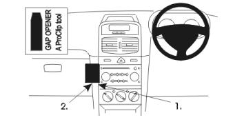 Figyelem! Mielőtt a ProClip-et rögzítené, kérjük, figyelmesen olvassa el a használati útmutatót! 1. Nyissa ki a kesztyűtartót! A mellékelt réstágító keskeny végének segítségével tágítsa ki a rést a szabályzó-panel és a műszerfal között, a rádió-berendezés alsó részénél! Távolítsa el a ragasztócsíkok borítását a ProClip-ről! 2. Nyomja a ProClip rövid bal oldali részét a réstágító fölötti résbe! Húzza ki a réstágítót! 3. Nyomja a réstágítót a résbe a kesztyűtartó és a műszerfal között! Nyomja előre a ProClip-et úgy, hogy a ProClip szögletes jobb oldali része kerüljön a réstágító fölötti résbe! Húzza ki a réstágítót! Csukja be a kesztyűtartót! 4. A ProClip a helyére került. |