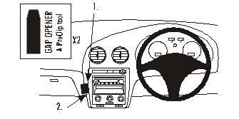 Figyelem! Mielőtt a ProClip-et rögzítené, olvassa el a használati útmutatót 1. A mellékelt réstágítók keskeny végeinek segítségével tágítsa ki a rést a szabályzó-panel és az azt körülvevő keret között! Helyezze a réstágítókat körülbelül 8-10 cm távolságra egymástól, ahogy a képen látható! Távolítsa el a ragasztócsík borítását a ProClip-ről! 2. Nyomja a ProClip bal oldali részét a réstágítók közti résbe! Húzza ki a réstágítókat! 3. Nyomja a réstágítókat a résbe a műszerfal és a szabályzó-panelt körülvevő keret között! Nyomja előre a ProClip-et úgy, hogy a jobb oldali része beakadjon a réstágítók közti résbe! Húzza ki a réstágítókat! 4. A ProClip a helyére került. |