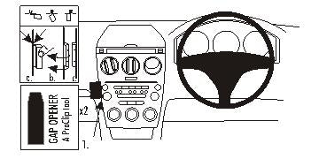 Figyelem! Mielőtt a ProClip-et rögzítené, olvassa el a használati útmutatót! Ez a ProClip két részből áll. 1. rész: a rögzítő darab (a kisebbik rész) 2. rész: a ProClip előlap 1. A mellékelt réstágítók keskeny végeinek segítségével tágítsa ki a rést a szabályzó-panel és a műszerfal között! Helyezze a réstágítókat körülbelül 8-10 cm távolságra egymástól! 2. Távolítsa el a ragasztócsík borítását a rögzítő darabról! Nyomja a rögzítő darabot a réstágítók közti résbe! Nyomja a rögzítő darabot jobbra, el a kormánykeréktől úgy, hogy a szögletes pereme beakadjon a szabályzó-panel mögé, és a ragasztócsík odatapadjon a műszerfalhoz! Húzza ki a réstágítókat! 3. Nyissa fel az előlap előre kifúrt lyukait a csavarhúzóval (Philips)! Távolítsa el a ragasztócsík borítását az előlapról! Igazítsa az előlapot a rögzítő darabra úgy, hogy a ragasztócsík a bal oldalra essen, és a lyukak illeszkedjenek! Csavarozza az előlapot a rögzítő darabra a mellékelt csavarokkal! FONTOS: Egyenesen csavarja be a csavart a rögzítő darabba, a rögzítő darabbal azonos szögben! 4. A ProClip a helyére került. |