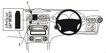 Figyelem! Mielőtt a ProClip-et rögzítené, olvassa el a használati útmutatót! 1. A mellékelt réstágító keskeny végének segítségével tágítsa ki a rést a műszerfal és a légbefúvót körülvevő keret között! Távolítsa el a ragasztócsík borítását a ProClip-ről! 2. Nyomja a ProClip alsó részét a ragasztócsíkkal a résbe a szabályzó-panel és a légbefúvót körülvevő keret között! 3. Akassza a ProClip felső részének szögletes peremét a réstágító melletti résbe! Húzza ki a réstágítót! 4. A ProClip a helyére került. |