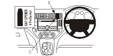 Figyelem! kérjük, figyelmesen olvassa el a használati utasítást és nézze meg az ábrákat, mielőtt rögzíti a ProClip-et! 1. A mellékelt réstágító keskeny végét nyomja a rádiót körülvevő keret és a légbefúvót körülvevő keret közötti résbe, hogy kitágítsa azt! Távolítsa el a ProClip ragasztócsíkjának borítását! 2. Nyomja a ProClip alsó, ragasztócsíkkal ellátott részét a réstágító mellett a résbe! Húzza ki a réstágítót! 3. Nyomja a réstágítót a légbefúvót körülvevő keret és a műszerfal közötti résbe! Nyomja a ProClip felső részének barázdált szegélyét a réstágító mellett a résbe! Húzza ki a réstágítót! 4. A ProClip a helyére került. |