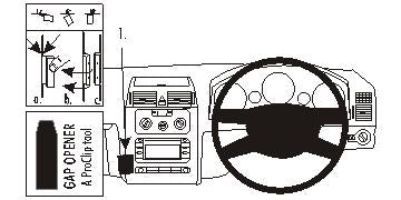 Kérjük, olvassa el az összes utasítást és tanulmányozza a képeket, mielőtt a tartót rögzítené! Ez a ProClip két részből áll. 1. rész: a rögzítő darab (a kisebbik rész) 2. rész: a ProClip előlap 1. A mellékelt réstágító keskeny végének segítségével tágítsa ki a rést a szabályzó-panel és az azt körülvevő keret között! Távolítsa el a ragasztócsík borítását a rögzítő darabról! Nyomja a rögzítő darab szögletes peremét a réstágító alatti résbe! 2. Nyomja el a rögzítő darabot a kormánykeréktől úgy, hogy a szögletes pereme beakadjon a szabályzó-panel mögé, és a ragasztócsík odatapadjon! Húzza ki a réstágítót! 3. Nyissa fel az előre kifúrt lyukakat az előlapon a csavarhúzóval (Philips). Távolítsa el a ragasztócsík borítását az előlapról! Igazítsa az előlapot a rögzítő darabra úgy, hogy a lyukak illeszkedjenek, és a ragasztócsík balra essen! Csavarozza az előlapot a rögzítő darabra a mellékelt csavarokkal! Egyenesen csavarozza a rögzítő darabba, a rögzítő darabbal azonos szögben! 4. A ProClip a helyére került. |