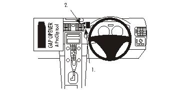 Kérjük, olvassa el az összes utasítást és tanulmányozza a képeket, mielőtt a tartót rögzítené! 1. A mellékelt réstágító keskeny végének segítségével tágítsa ki a rést a légbefúvót körülvevő keret és a műszerfal között! Nyomja a ProClip alsó részének barázdált peremét a réstágító fölötti résbe! Nyomja, amíg érzékelhetően bepattan a résbe! Húzza ki a réstágítót! 2. Nyomja előre a ProClip felső részét úgy, hogy a barázdált pereme bepattanjon a résbe a légbefúvót körülvevő keret és a műszerfal között! Nyomja, amíg érzékelhetően bepattan a résbe! 3. Nyomja előre a ProClip-et úgy, hogy teljesen a résekbe kerüljön! 4. A ProClip a helyére került. |