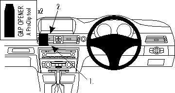 Kérjük, figyelmesen olvassa el az összes utasítást és tanulmányozza a képeket, mielőtt a ProClip-et rögzítené! 1. A mellékelt réstágító segítségével tágítsa ki a rést az alumínium belső kárpitozás és a klímavezérlő kerete közt. Távolítsa el az öntapadó matricákat a ProClipről. A ProClip alsó részét nyomja a réstágító által kitágított rés közé. Nyomja addig, amíg nem hallja/érzi, hogy teljesen a helyére került. Húzza ki a réstágítókat. 2. Nyomja a réstágítót óvatosan a z alumínium belső kárpitozás és a műszerfal közé. Nyomja a ProClipet addig, amíg a felső része be nem akad a résbe. A ProClip bal sarkát óvatosan nyomja lefelé, majd győződjön meg róla, hogy teljesen a helyére került. 3. Óvatosan nyomja lefelé a ProClip jobb sarkát, majd győződjön meg róla, hogy a helyére került. Húzza ki a réstágítót. 4. A ProClip a helyére került. |