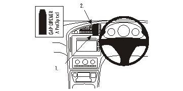 Please read all of the instructions and look at the pictures before attaching the ProClip. 1. Press the thin end of the enclosed gap opener into the gap between the stereo and the surrounding panel, to widen the gap. Peel off the adhesive tape cover on the ProClip. Press the curved edge on the lower part of the ProClip into the gap next to the gap opener. 2. Flip the ProClip upwards so the curved lower edge hooks behind the stereo. Pull out the gap opener. Press the gap opener into the gap between the panel surrounding the air vent and the dashboard. 3. Press upwards/forwards on the ProClip so the angled upper edge hooks over the edge, into the gap next to the gap opener. Pull out the gap opener. 4. The ProClip is in place. |