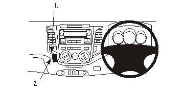 Kérjük, figyelmesen olvassa el az összes utasítást és tanulmányozza a képeket, mielőtt a ProClip-et rögzítené! 1. Távolítsa el a ragasztócsík borítását a ProClipről. Akassza a ProClip felső részének levékonyított szélét az érmetartó alsó széle mögé. 2. Akassza a ProClip alsó részének levékonyított szélét a műszerfalon található résbe. 3. Nyomja előre a ProClipet, hogy a tapadó rész meg tudjon ragadni. 4. A ProClip a helyére került. |