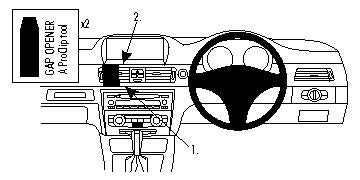 Kérjük, figyelmesen olvassa el az összes utasítást és tanulmányozza a képeket, mielőtt a ProClip-et rögzítené! 1. A mellékelt réstágító segítségével tágítsa ki a rést a fabetétes belső kárpitozás és a klímavezérlő kerete között. Távolítsa el az öntapadó matricákat a ProClipről. A ProClip alsó részét nyomja a réstágítók által kitágított rés közé. Nyomja addig, amíg nem hallja/érzi, hogy a helyére került. Húzza ki a réstágítókat. 2. Nyomja a réstágítót óvatosan a fabetétes belső kárpitozás és a műszerfal közé. Nyomja a ProClipet addig, amíg a felső része be nem akad a résbe. A ProClip bal sarkát óvatosan nyomja lefelé, majd győződjön meg róla, hogy teljesen a helyére került. 3. Óvatosan nyomja lefelé a ProClip jobb sarkát, majd győződjön meg róla, hogy a helyére került. Húzza ki a réstágítót. 4. A ProClip a helyére került. |