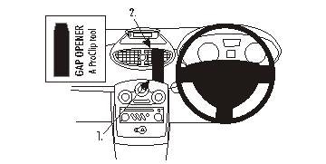 Kérjük, figyelmesen olvassa el az összes utasítást és tanulmányozza a képeket, mielőtt a ProClip-et rögzítené! Fontos, hogy a ProClip-et pontosan a képen látható pozícióban rögzítsük 1. Helyezze a csomagban található réstágítót a vékony felével a vezérlőpult és a műszerfal közötti résbe, hogy kitágítsa azt. Távolítsa el a ragasztócsík borítását a ProClipről. Nyomja a ProClip alsó részének lekerekített szélét a résbe, a réstágító mellé. 2. Nyomja a ProClip-et fölfelé/előre, hogy annak lekerekített alsó széle a vezérlő pult mögé akadjon be. Húzza ki a réstágítót. 3. Helyezze a réstágítót a vékony felével a levegő befúvó kerete és a műszerfal közötti hézagba. Nyomja előre a ProClip felső részét, hogy annak levékonyított széle a résbe menjen a réstágító mellé. Nyomja lefelé a ProClip-et a tetejénél, , hogy annak levékonyított széle mindenképpen a résbe menjen. Húzza ki a réstágítót. 4. A ProClip a helyére került. |